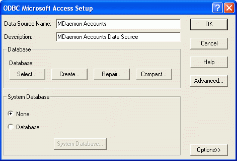 | 6. | 完了をクリックして、ドライバ固有の設定ダイアログを表示します。このダイアログは選択したドライバによって表示が異なります。 (次の例はMicrosoft Access設定ダイアログです) |
