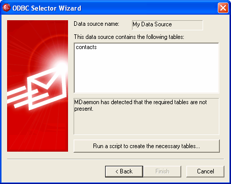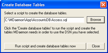 | 5. | データソースにMDaemonが必要とするテーブルがすでに含まれている場合は、手順 8.へ進んでください。それ以外は必要なテーブルを作成するスクリプトを実行...をクリックします。 |