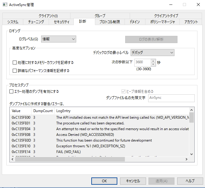 このセクションはActiveSyncのグローバルログレベルの設定用の画面です。ドメインクライアント設定 でログレベルの設定が「継承またはデフォルト」になっていると、設定はこの画面から引継ぎます。