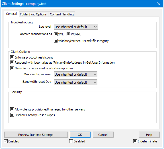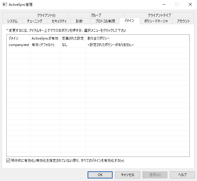 明示的に有効化/無効化を設定されていない限り全てのドメインを有効化する の設定を行う事で、ActiveSyncのデフォルト状態を設定できます。このオプションが有効の場合、全ドメインで、ActiveSyncはデフォルトで有効になります。これが無効の場合、ActiveSyncはデフォルトで無効です。ドメイン毎に有効か無効を設定すると、デフォルトの設定値を上書きします。