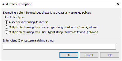 特定のデバイスタイプ、クライアントID、ユーザーエージェントをポリシー制限などから除外するにはこのオプションを使用します。