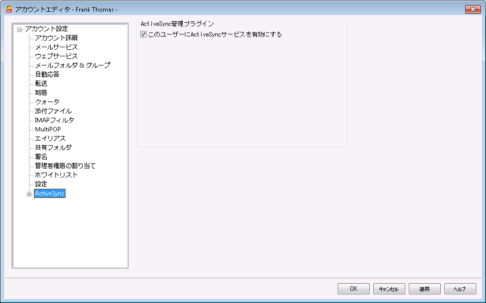 このユーザーにActiveSyncサービスを有効にする