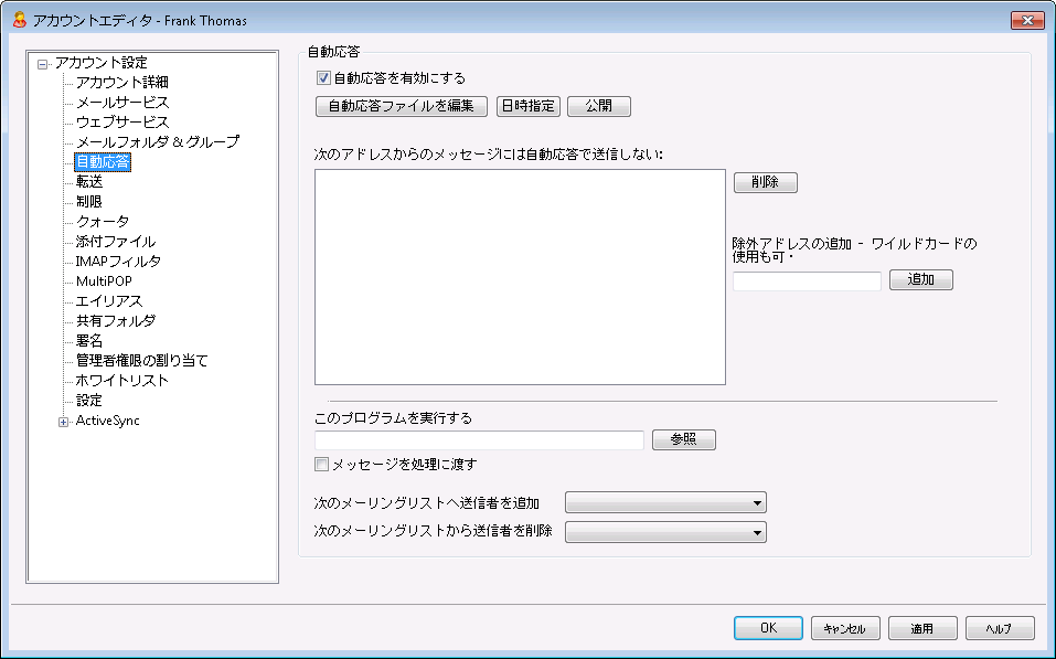 自動応答は、例えば、プログラムの実行、メーリングリストに送信者を追加、自動的に生成されたメッセージでの応答など、受信メールによって特定のイベントを発生するのに便利な機能です。自動応答で最も一般的な使用方法は、メールの受信者が休暇中ですぐに対応できず、できるだけ早く返信する、といった内容の返信を自動で送信するというものです。WebmailまたはRemote AdministrationへのWebアクセスを使って、MDaemonユーザは、自動応答メッセージの作成や自動応答の利用期間のスケジュール設定が行えます。最後に、自動応答はユーザーのルート\data\フォルダにあるOOF.mrkファイルの内容を元にしています。このファイルは多数のマクロに対応しており、その結果として、自動応答機能へ高い柔軟性を搭載しています。