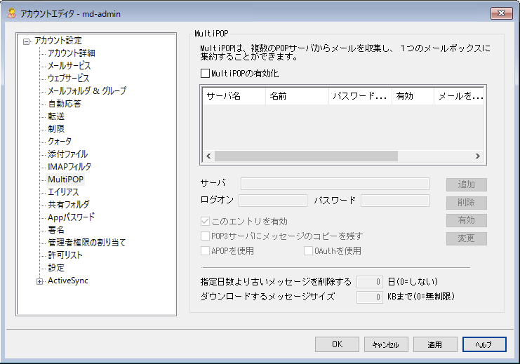 対応するホストからのメールを検索する際のAPOP認証にMultiPOPエントリを使用する場合は、このチェックボックスをクリックしてください。