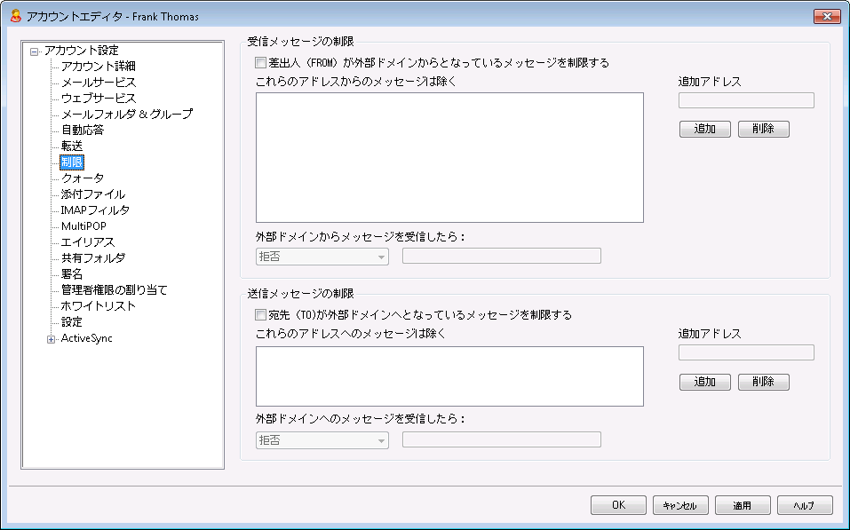 この画面では、アカウントがローカルではないドメインとのメッセージ送受信を制限するオプションの設定を行います。