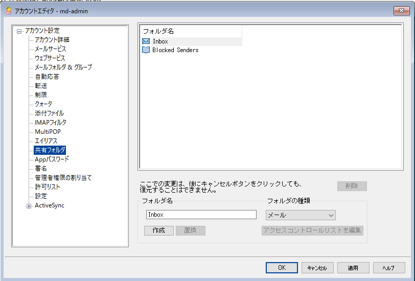 表示されているリストからIMAP共有フォルダを削除するには、目的のフォルダを選択し、削除ボタンをクリックしてください。