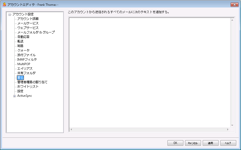 アカウントから送信する全メールの一番下に追加される署名を、この画面で設定できます。この署名は、例えばWebmailや他のメーラーの署名追加オプション、署名/フッタオプション、メーリングリストフッタといった、他の署名やフッタの後に挿入されます。デフォルト/ドメイン署名やメーリングリスト用フッターは、アカウント署名の後に追加されます。