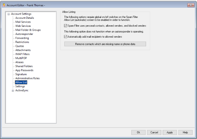 ローカルではないアドレスへメール送信を行う度にアカウントの許可リストフォルダを更新するにはこのオプションを選択します。上記の、スパムフィルタで個人連絡先、許可リスト、ブロックリストを使用のオプションと併用する事により、スパムフィルタの誤検知は劇的に減少します。許可リスト (自動)にある、許可リスト連絡先を自動で更新するオプションを、この機能を利用する前に有効化しておく必要があります。