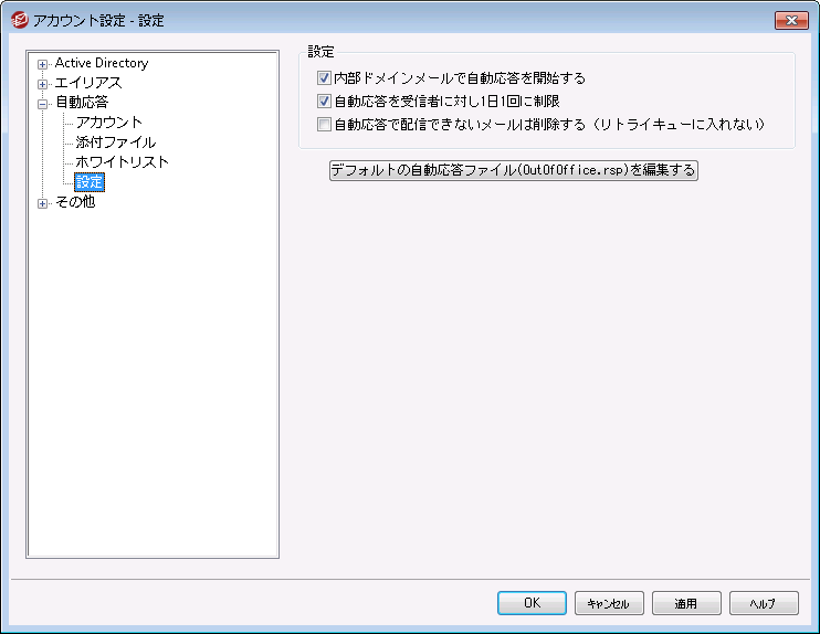 デフォルトで、ローカルおよびリモートメールで、自動応答が実行されます。ユーザーと同じドメイン内のメールに対しては自動応答を送信しない場合はこのオプションを無効にして下さい。