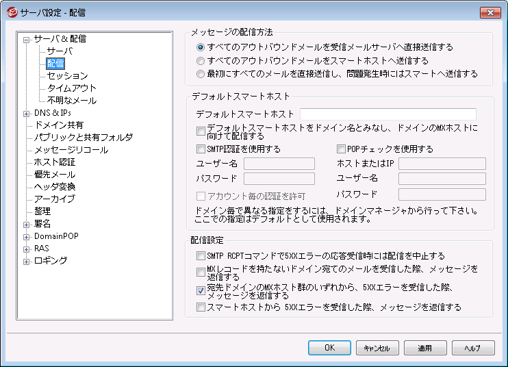 宛先ドメインに関係なく、すべての送信メールを配信用の別のサーバへスプールする場合には、このオプションを選択します。このオプションを選択すると、すべての送信メールは、デフォルトスマートホストとして指定されたサーバーへ送信されます。この機能は通常、メールが大量にあり、直接のメール配信がサーバリソースの過度な負荷を招く場合がある時に便利です。メッセージを指定されたサーバに配信することができない場合、リトライキューへ移動し、メールキューダイアログのRetryキュー画面で設定するパラメータおよび時間間隔に従って再配信を継続します。