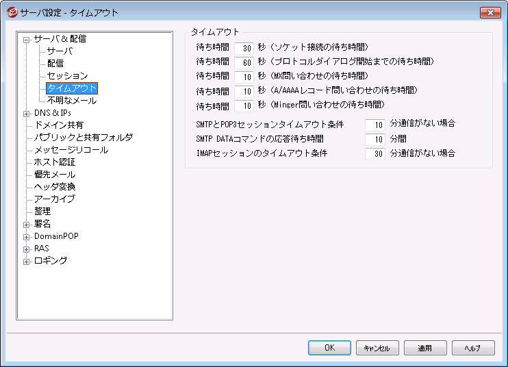 SMTPとPOP3セッションタイムアウト条件 XX 分通信がない場合