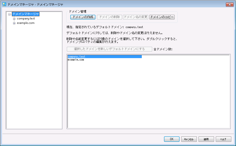 デフォルトドメインに対しては、削除や名前の変更が行えません。もし、削除や名前の変更を行いたい場合には、最初にデフォルトドメインとして別のドメインを選択してから行ってください。 |