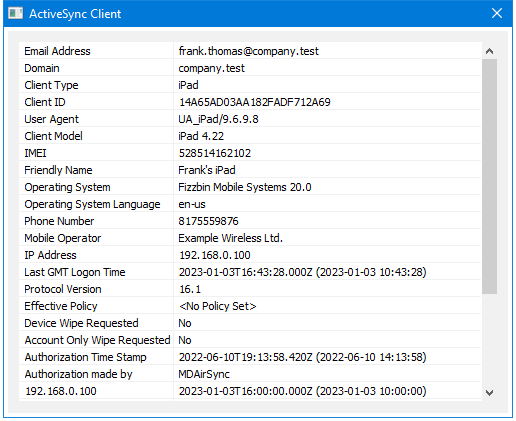 ここではドメインに関連付けされたActiveSyncデバイス毎のエントリが確認できます。