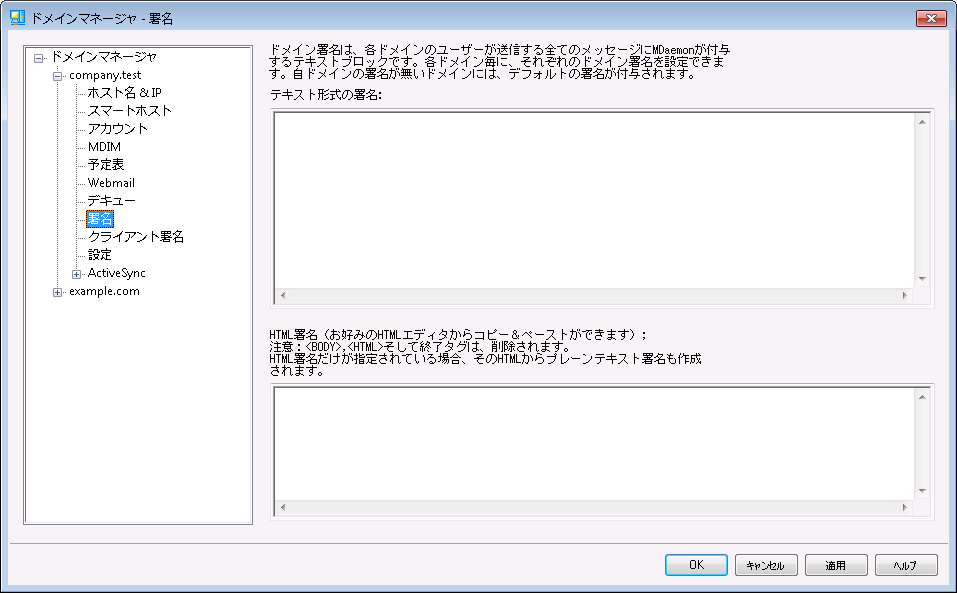 ここではテキスト形式の 署名を指定します。もしもHTML形式の署名を使いたい場合は、次のHTML形式の署名を使って下さい。署名が両方に設定されていた場合、MDaemonはメッセージのフォーマットに応じて適した方の署名を使用します。html形式の署名が指定されていない場合は形式を問わずテキスト形式の署名が追加されます。