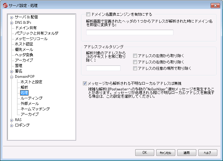 このオプションはサイトが要求するドメインエイリアスの数を減らすことができます。メッセージがダウンロードされると、メッセージから解析されるすべてのアドレス中の全ドメイン名は、ここで指定されるドメイン名に変換されます。