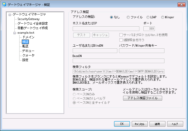 MDaemonは、こうした問題を防ぐために、受信メールのアドレスを検証する事ができます。外部のドメイン用サーバーがLDAPやActive Directoryサーバーでメールボックスやエイリアス、メーリングリストの情報を最新の状態にしていた場合や、Mingerサーバーで外部のアドレス認証を行っていた場合、MDaemonでもLDAPやAD、Mingerサーバーを指定し、今後example.com宛てのメールが到着した際、宛先アドレスの問合せを指定したサーバーに対して行う事ができます。