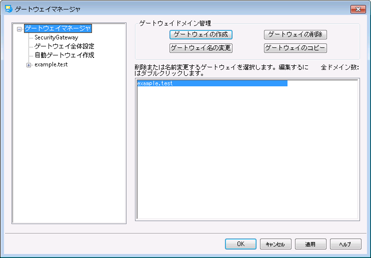 ダイアログの左側にあるナビゲーションでは、ゲートウェイの一覧が確認でき、ここからゲートウェイ毎の様々な設定画面へアクセスできます。ここからは、ゲートウェイ全体設定や自動ゲートウェイ作成へもアクセスできます。右側の一覧はドメインの削除や名称変更に使用します。一覧からゲートウェイをダブルクリックし、それぞれの設定画面へ切り替える事ができます。