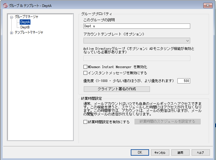 ここでは、グループへアカウントテンプレートを適用し、グループメンバーの細かなアカウント設定をコントロールできます。また、グループはActive Directoryグループとリンクさせる事もでき、メンバーがMDaemon Instant Messenger (MDIM)の利用を行えるかどうかや、優先度などの設定も行えます。グループメンバーの設定は、アカウントエディタのグループマネージャか、メールフォルダ & グループから行えます。