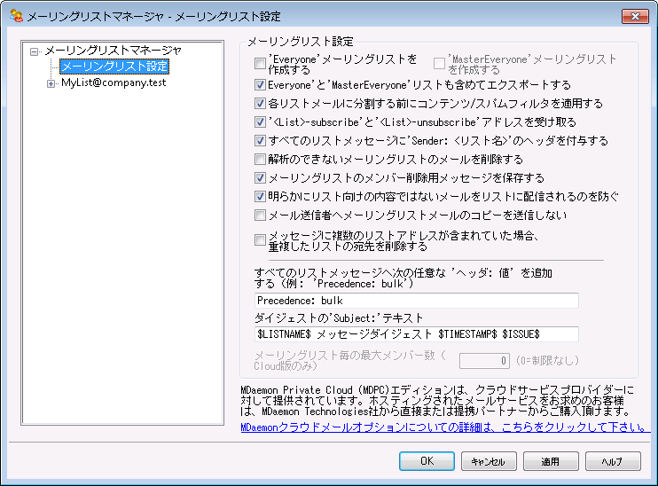 メーリングリスト毎に設定できる最大メンバー数を設定するにはこのオプションを使用します。ドメイン毎の最大メンバー数は、ドメインマネージャの設定画面で設定できます。このオプションはMDaemon Private Cloudでのみ使用できます。