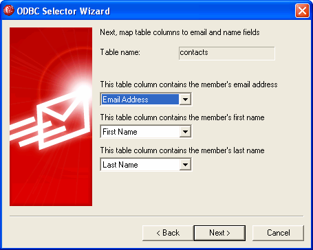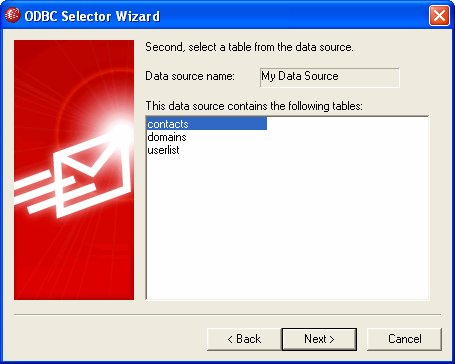 | 5. | データソースは、メールアドレスと名前のフィールドを持つテーブルが少なくとも1つなければなりません。この条件を満たす1つ以上のテーブルがある場合、使用するテーブルを選択して次へをクリックしてください。それ以外の場合は、キャンセルをクリックしてウィザードを終了し、次の手順に進む前にデータベースアプリケーションを使用して、関連データベースにテーブルを追加してください。 |
