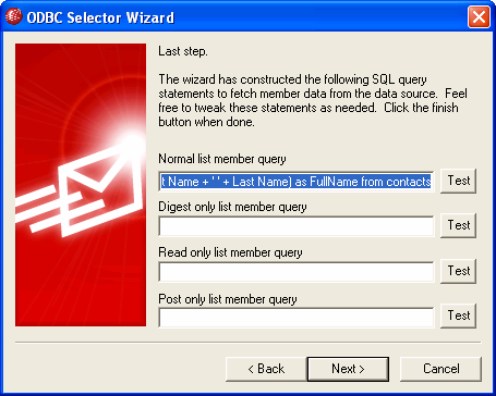 | 7. | ODBC選択ウィザードは、手順6で選択した内容に基づいてSQLステートメントを構成します。MDaemonは、それを使用してデータベースから標準メーリングリストメンバーのデータを検索します。メンバーにダイジェストモードでメールの受信またメンバーを受信専用あるいは投稿専用として指定するためにこのステートメントを編集、残りのコントロールで他のクエリステートメントを指定ことができます。各コントロールの横にあるテストボタンで、クエリステートメントが適切なデータを検索するかどうかを確認することができます。クエリのステートメントの構成が完了したら次へボタンをクリックします。 |