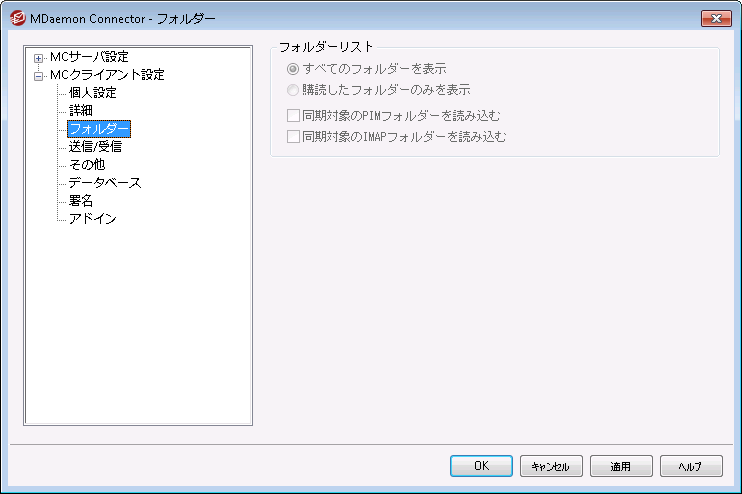 デフォルトでOutlookのフォルダ一覧画面ではMDaemon Connectorユーザーがアクセスできるメールサーバー上の全フォルダを表示します。