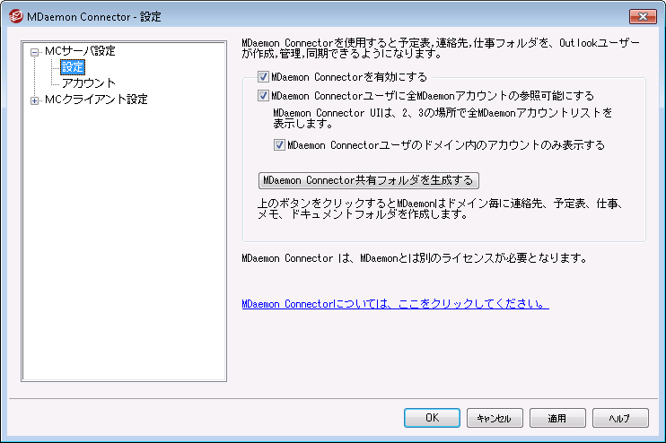 MDaemon Connector(MC)を有効にするには、このチェックボックスをクリックします。このオプションが有効になっていない限り、ユーザはMCの機能を利用できません。