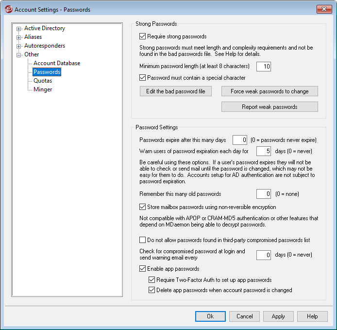 メールボックスのパスワードを復元できない暗号化方式で暗号化し保管するにはこのオプションを有効にして下さい。これにより、パスワードはMDaemon、管理者、攻撃者の誰からも復元できなくなります。これを有効にすると、MDaemonはbcryptパスワードハッシュを使用します。これは今までよりも長いパスワード(72文字まで)を許可しており、アカウントのエクスポートやインポートの際には、パスワAPOP & CRAM-MD5認証や弱いパスワード検出などMDaemonによって復元する機能がある場合もあり、この機能との互換性はありません。復元できないパスワードはデフォルトで有効です。