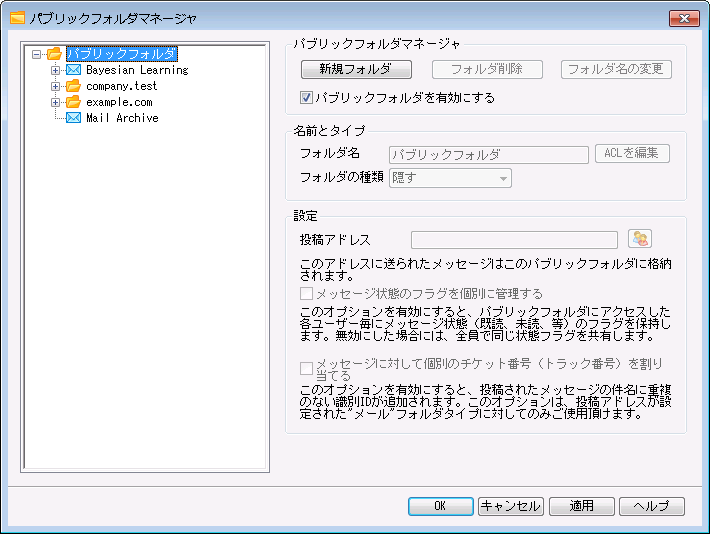 新しいパブリックフォルダを作成するには、親フォルダを選択し、「新規フォルダ」をクリックします。フォルダ名を入力し、種類を選択した後、OKボタンをクリックします。