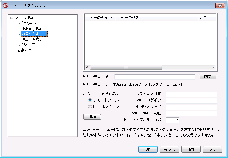 ローカルやリモート用のカスタムメールキューは、 キュー » メールキュー で作成します。カスタムキューに対応している事で、MDaemonは、メール送信用の複数のロケーションを監視する事ができます。新規のキューを作成しローカルまたはリモートを指定することができます。また、メッセージをカスタムメールキューに自動的に配置するコンテンツフィルタルールの使用もでき、リモートキューについて、キューでの処理を行う頻度をコントロールするカスタムスケジュールを作成するイベントスケジューラを使用することができます。