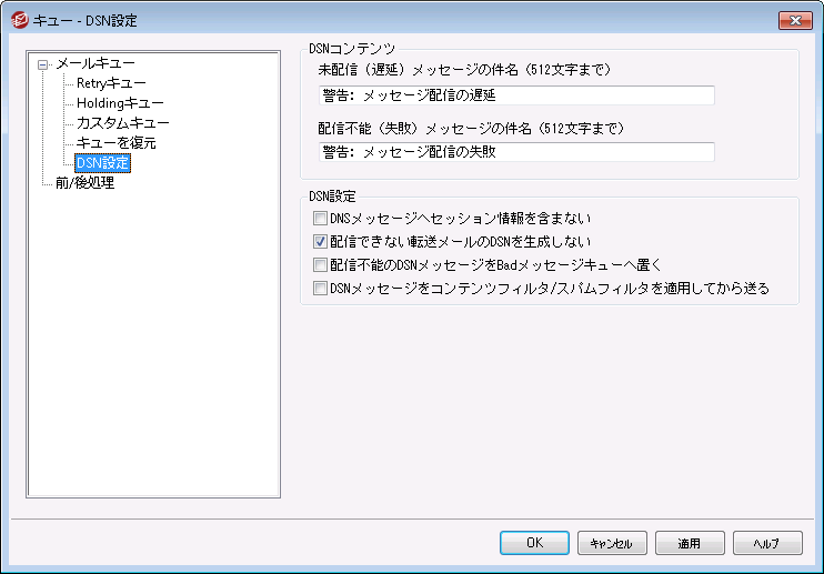 MDaemonでは、一時的又は恒久的に、メッセージ配信で問題が生じた場合、不達メール (DSN) をメールの送信者へ送ります。この画面ではDSNメッセージに関連する様々なオプションが設定できます。この画面へは、キュー » メールキュー/DSN... » DSN設定からアクセスできます。