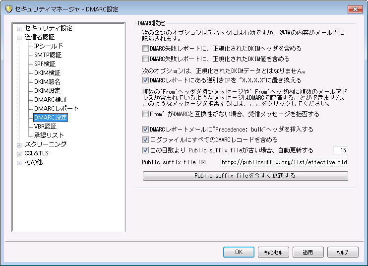 DMARCではDNSレコードの問合せ先ドメインの信頼性を確認するため、public suffix fileを要求します。デフォルトでMDaemonは保持している15日経過したpublic suffix fileを自動更新します。この日数を変更したい場合は値を任意のものへ変更して下さい。自動アップデートを行わない場合はこのオプションを無効にします。