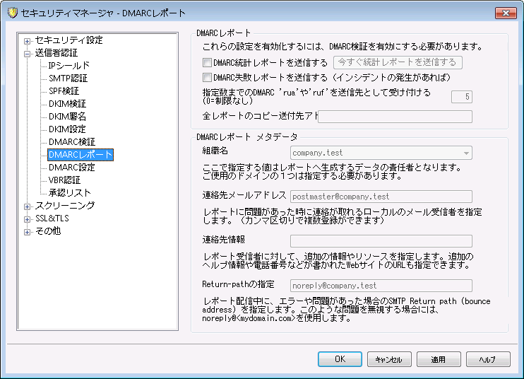 MDaemonがDNSへDMARCレコードの問合せを行った際、DMARCレコードに、対象ドメイン所有者が、そのドメインを名乗ったメールをレポートとして提供するように求めるタグが含まれている場合があります。DMARCレポートのオプションでは、要求されている統計又は失敗レポートを送信するかどうかや、レポートに追加するメタ情報の指定を行う事ができます。この画面にあるオプションは、DMARC検証でDMARC検証とレポートを有効にする オプションが有効化されている場合にのみ利用できます。また、DMARCの仕様によると、レポートの宛先サーバーが対応していれば、レポート送信にはSTARTTLS を使用する必要があります。STARTTLSを可能な限り有効化して下さい。