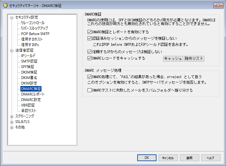 このオプションを有効にすると、MDaemonは受信メールのFrom:に含まれているドメインについて、DMARC DNS問合せを行い、DMARCレポート画面で設定されていれば、統計レポートや失敗レポートの送信を行います。DMARCはメールの検証にSPF や DKIM を使っているため、DMARCを使う前に最低どちらか1つの機能は有効化されている必要があります。DMARC検証とレポートはデフォルトで有効になっており、ほとんどのMDaemon設定で使用されています。