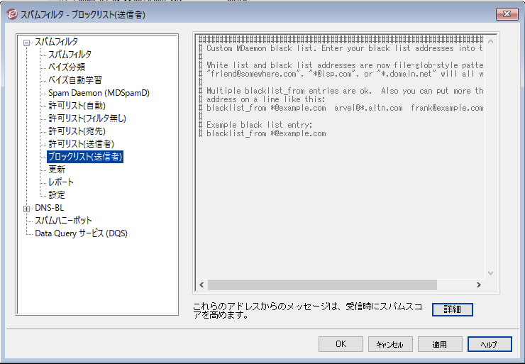 詳細 をクリックしてアドレスをこのリストへ追加します。 このブロックリストにあるアドレスからのメールは、スパムフィルタ設定で指定したスコアへ、スパムフィルタスコアを加算するようになります。一般的にはこれでスパムとしてマークされるようになりますが、このアドレスが自動でスパムとして認識されるようになるわけではありません。例えば、送信者がブロックリストへ含まれていても、受信者が許可リストに含まれていた場合、スコアはそれぞれのスコアを相殺して、最終的にしきい値を下回っていた場合は、メールは送信者へ配信されます。これはブロックリストのスコアを小さい値で設定していた場合などに起こります。