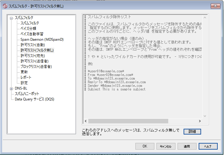 詳細をクリックし、宛先アドレスを指定できます。これらのアドレス宛のメッセージは、スパムフィルタによって処理されません。