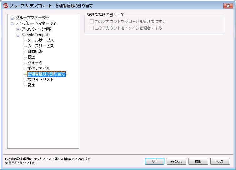 この画面はアカウントの作成テンプレートでは利用できません。管理者権限を新しいアカウントへ自動で割り当てる事はできません。管理者権限をアカウントへ割り当てるためには、この画面でアクセスを許可したカスタマイズテンプレートを対象アカウントへ割り当てるか、手動でアカウントエディタの管理者権限の割り当て から管理者権限を割り当てる必要があります。 |