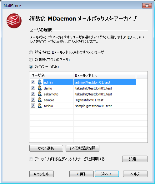MDaemonサーバのホスト名と、全てのメールボックスへアクセスできる管理者アカウントの情報を入力するだけで、MDaemonに登録済のアカウント全てのメールアーカイブが行えます。