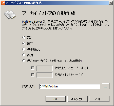 例えば年度ごとにデータを管理したり、増分のみをバックアップをしたり、といったようにアーカイブ格納領域を 一定の単位で分けておくと運用管理上、非常に便利です。 MailStoreではアーカイブ格納領域を、毎年あるいは毎月といった 一定の期間、あるいはメッセージ数やデータサイズを基準に一定のルールのもとで、自動的にアーカイブ格納領域を作成する ことができますので、定期的に手動で作成する手間は不要です。