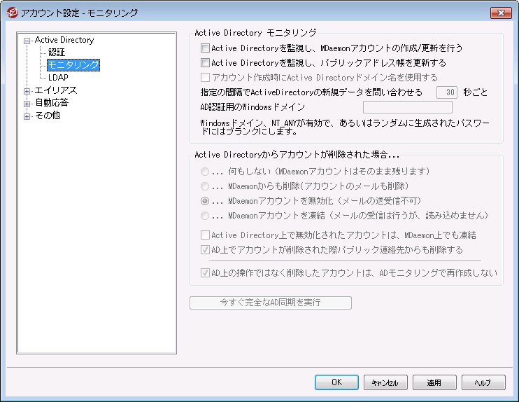 Active Directoryを監視し、MDaemonアカウントの作成/更新を行う