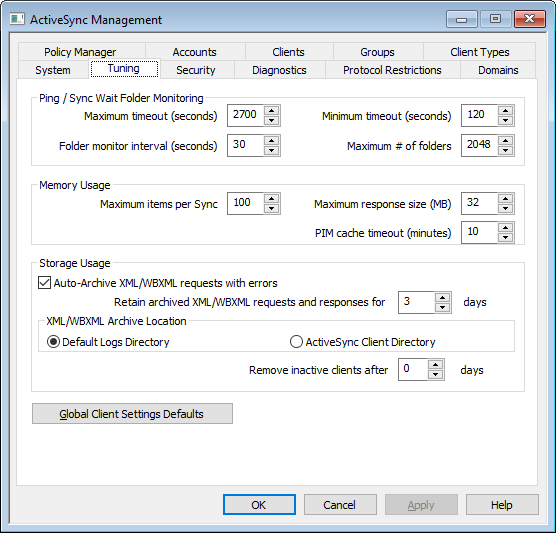ここでは、ほとんど調整の必要がない詳細設定を行う事ができ、 グローバルクライアント設定のデフォルト ボタンから、ActiveSyncクライアントのデフォルト値の調整も行えます。