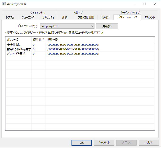 このボタンでActiveSyncポリシーエディタ を起動し、ポリシーの作成や編集が行えます。