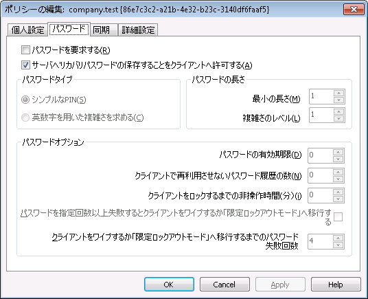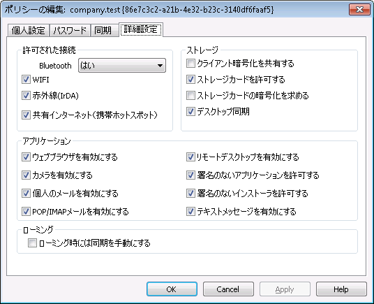 ActiveSyncポリシーエディタActiveSyncポリシーエディタには個人設定、パスワード、同期、詳細設定の4つのタブがあります。 この詳細設定タブはActiveSyncシステム 場面の詳細ポリシーオプションの変更を有効にするをアクティブにするまで非表示になっています。