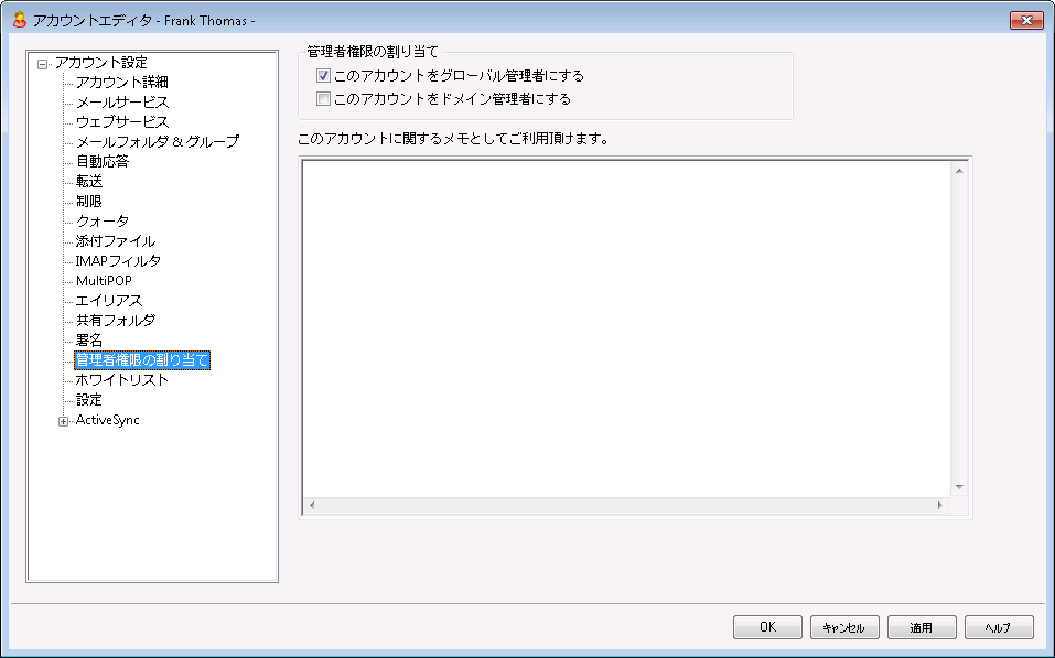 この画面ではアカウントに関する非公開のメもや情報を記載します。アカウント詳細の説明と異なり、管理者メモは他の公開連絡先情報と同期したり、Active Directoryのフィールドと関連付けられる事はありません。