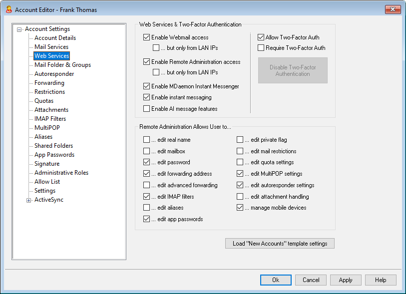 MDaemonのユーザに、Remote Administration経由でのアカウント設定の変更を許可する場合は、この機能を有効にしてください。ユーザは以下の項目で有効にした設定のみを編集することが可能です。