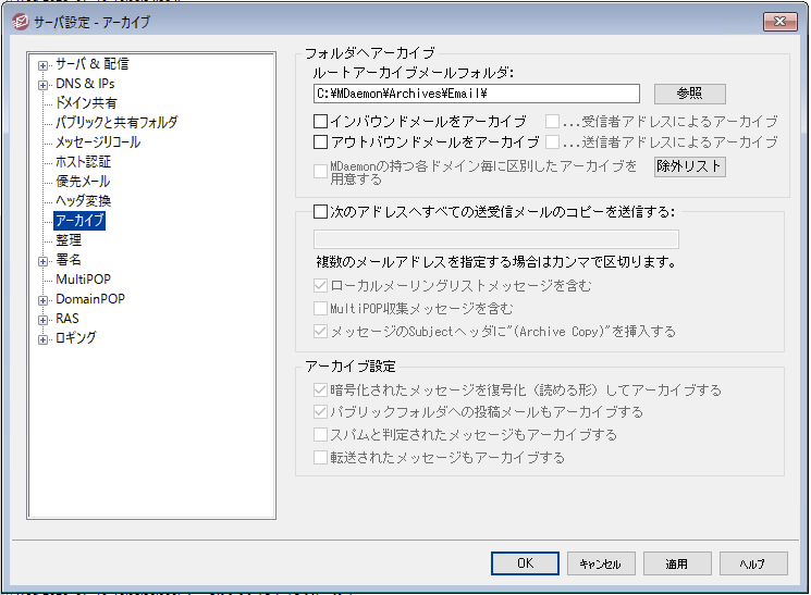 全ての送受信メールをフォルダへアーカイブする時には、この機能を使用してください。デフォルトのアーカイブフォルダは C:\MDaemon\Archives\Email\ フォルダですが、これは任意のフォルダへ変更できます。ローカルユーザー「宛て」の受信メールのアーカイブ、ローカルユーザー「から」の送信メールのアーカイブ、又はその両方をアーカイブするかを選択できます。メーリングリストのメール、転送メール、システムレベルのメール、自動応答はアーカイブされず、スパムやウィルス感染したメールもアーカイブされません。
