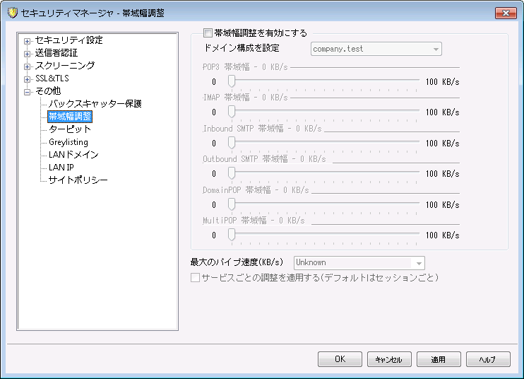 デフォルトであるセッションごとの帯域幅調整ではなく、サービスごとの調整に変更する場合は、このチェックボックスを選択してください。サービスごとの調整の場合、サービスに指定される帯域幅は同じサービスタイプのすべてのセッションの合計をモニタし、各々に対して帯域幅の合計を等しく分配します。例えば、同時に接続している複数のIMAPクライアントが使用する帯域幅の合計は、接続しているクライアントの数に関わらず、指定された帯域幅を超えることは決してありません。しかし、セッションごとの調整の場合は、1つのIMAPセッションは指定された帯域幅を超えることはありませんが、セッションの合計の帯域幅は指定された値を超えることができます。