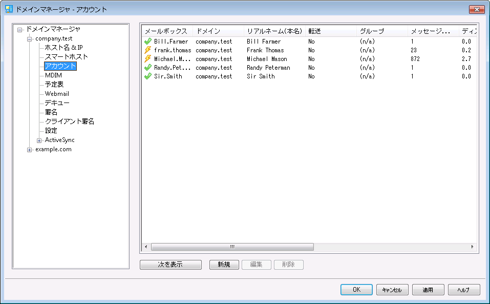 アカウントページでは、管理しているMDaemonアカウントが一覧表示されます。 リストの各エントリは、アカウントのステータスアイコン(後述を参照)、メールボックス、それぞれが属するドメイン、アカウント保有者の[リアルネーム]、所属するグループ、メッセージ数、使用しているディスク容量(MB)、最後のアクセス時間、メールの保存先フォルダです。このリストは、カラムを選択する事で、昇順または降順でソートすることができます。いずれかのカラムの見出しをクリックすると、リストは昇順でソートされます。同じカラムの見出しを再度クリックすると、次にリストは降順でソートされます。