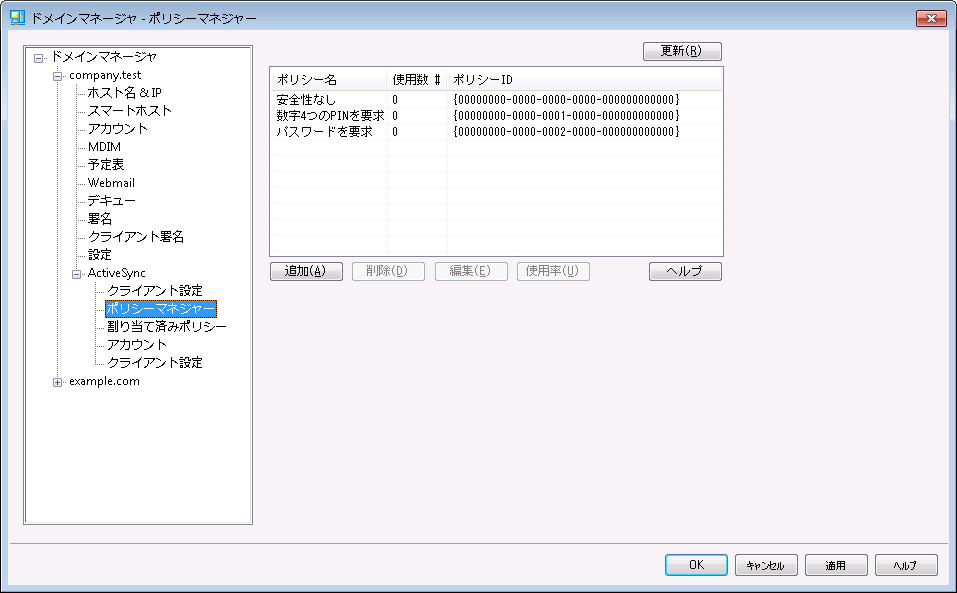 このボタンでActiveSyncポリシーエディタ を起動し、ポリシーの作成や編集が行えます。
