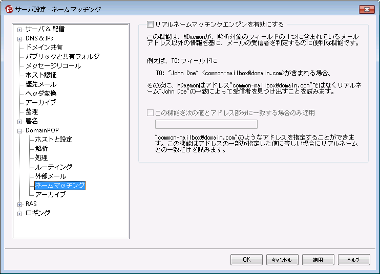 ネームマッチング機能は、DomainPOPメール収集エンジンと組み合わせた場合のみ動作します。この機能を使用する場合は、DomainPOPを有効にする必要があります。DomainPOPは 設定 » サーバ設定 » DomainPOP" で設定できます。 |